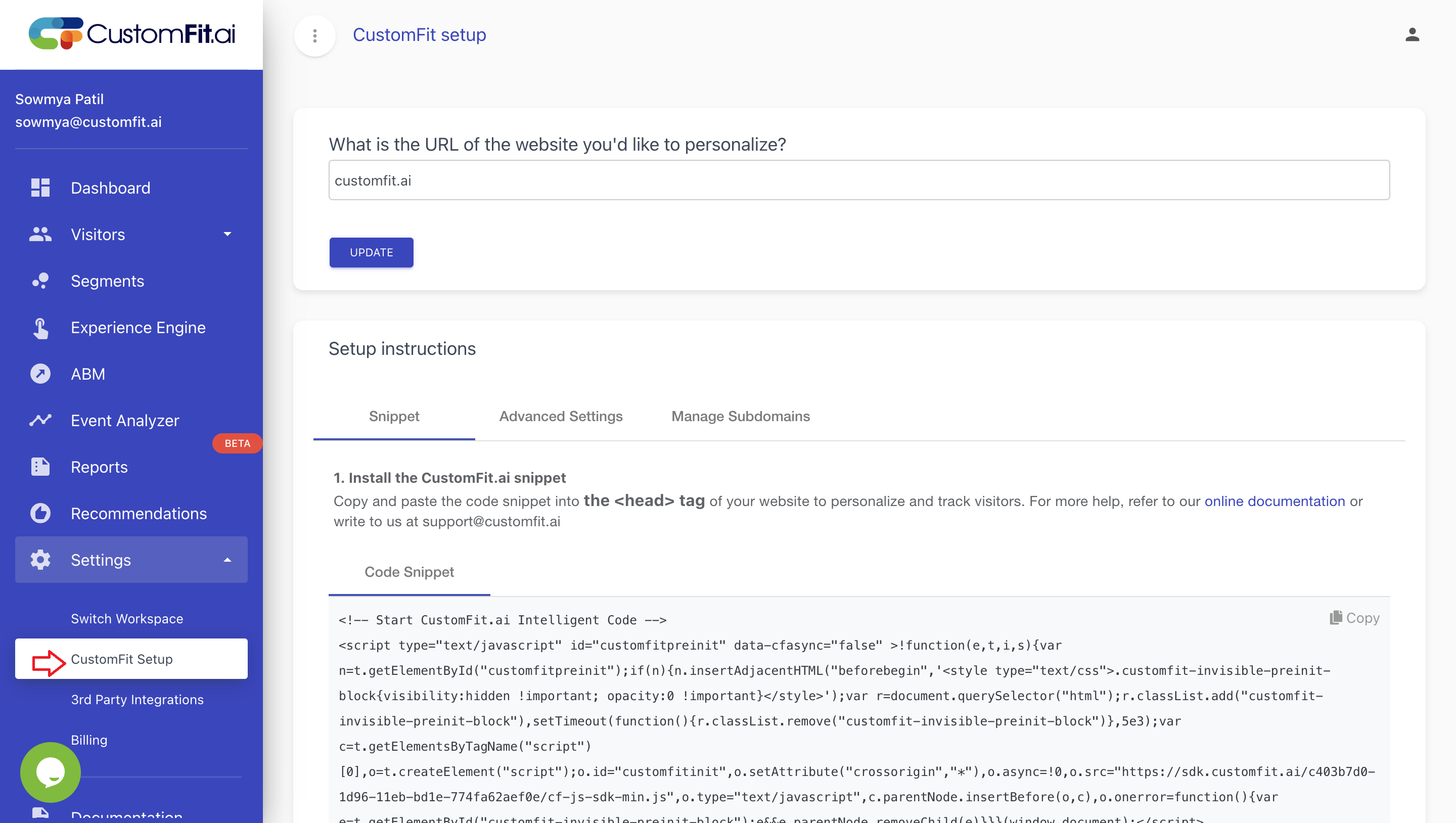 * Paste the copied code snippet into the **\<head>** tag of your website to personalize and track visitors.