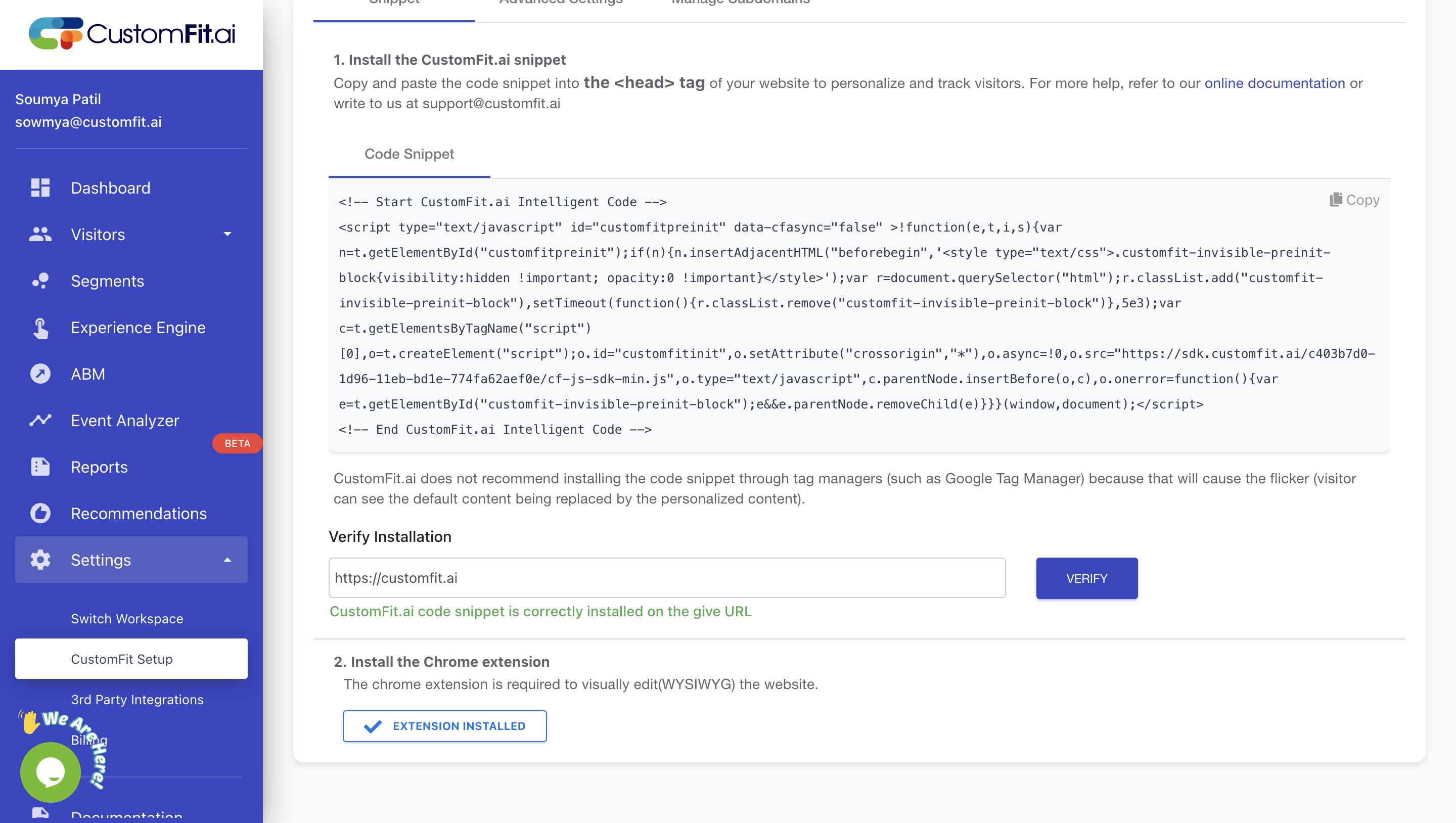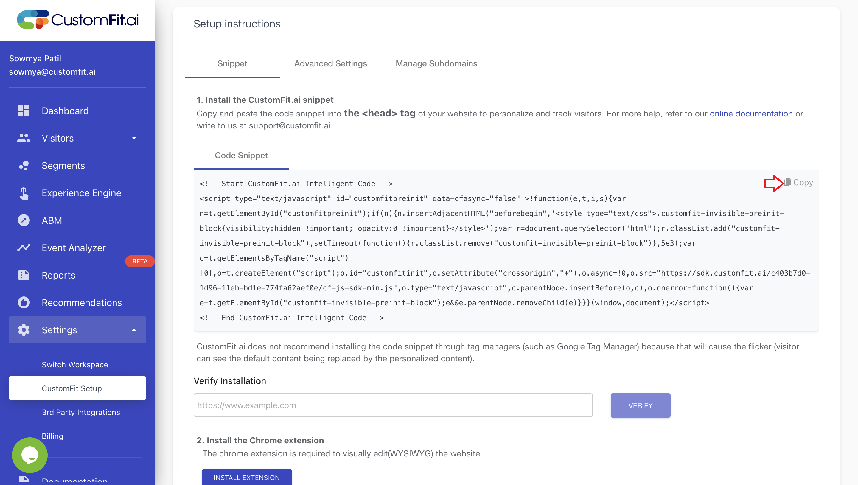 To provide a personalized experience to your website visitors, your initial step is to install the [CustomFit.ai](http://customfit.ai/) code snippet on your website. This installation is a one-time setup and doesn't require modification every time you run a new experience. To successfully complete this installation, you'll need access to your website's source HTML code.
